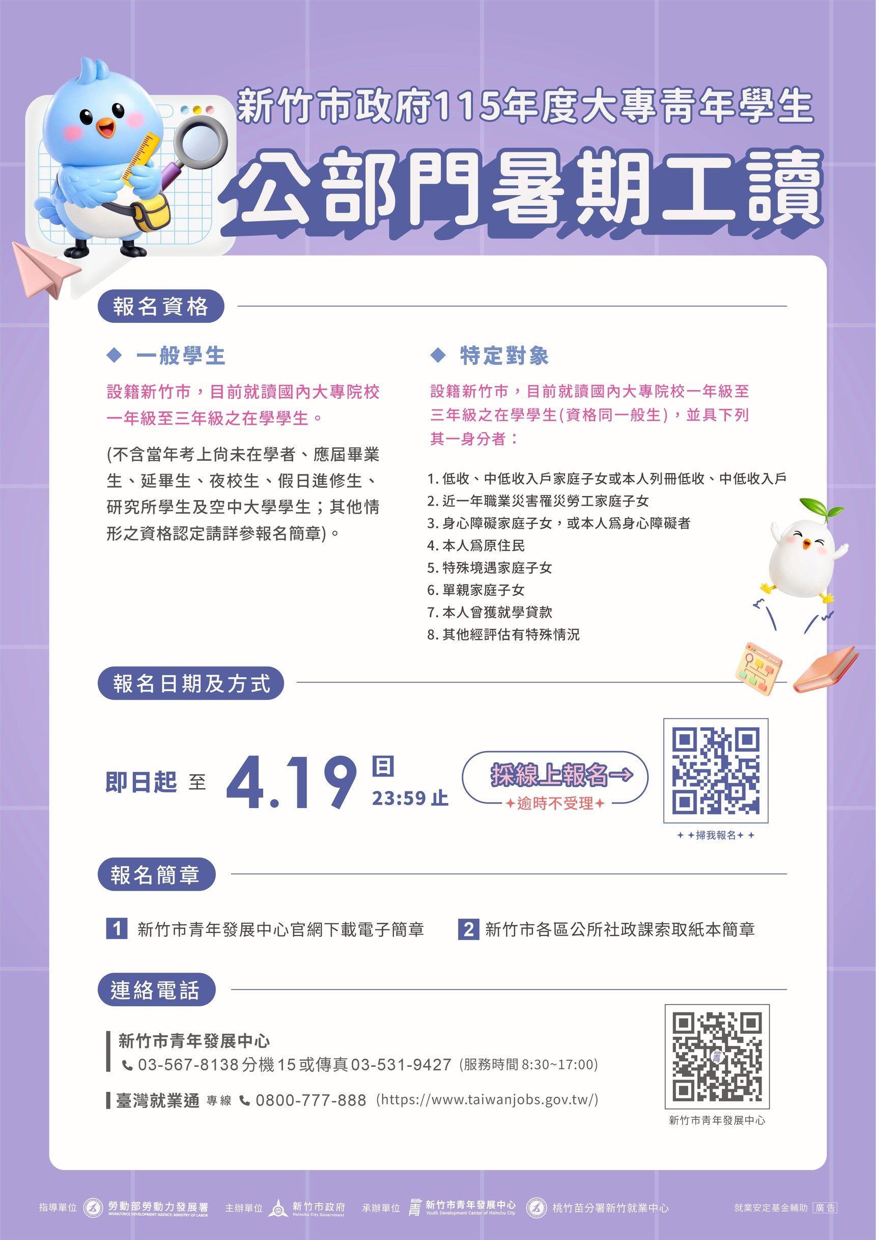 新竹市115年度「大專青年學生公部門暑期工讀活動」,至115年4月19日止 2026-04-09 |